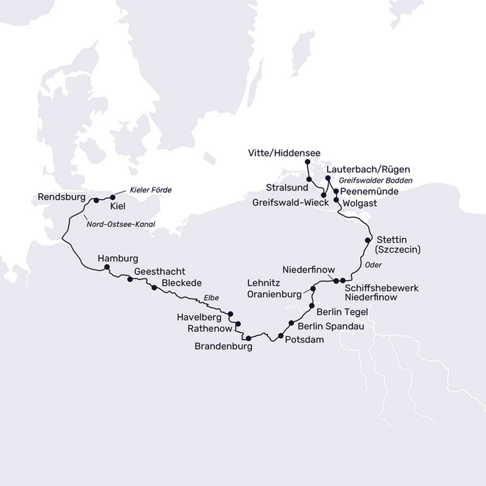 Stralsund – Vitte – Greifswald Wieck– Rügen – Wolgast – Stettin – Niederfinow – Lehnitz – Berlin Tegel – Potsdam – Brandenburg – Havelberg – Geesthacht – Hamburg – Rendsburg – Kiel