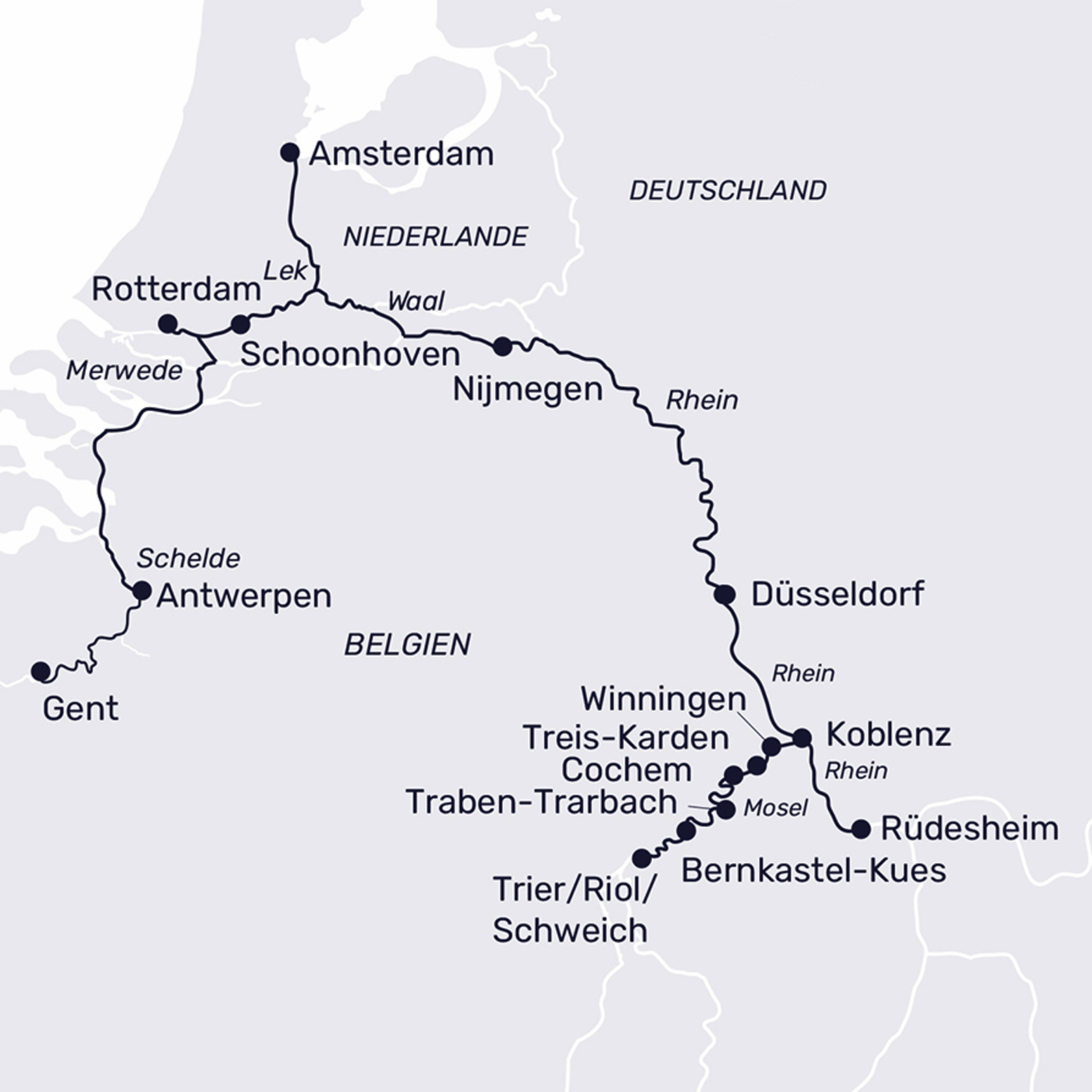 On this trip, the journey is the destination: starting at the Rhine, the Waal, Hollands Diep, Volkerak, Oosterschelde, Zeekanaal Gent-Terneuzen, and Lek will show you their world. In Belgium, you can stroll through the diamond city of Antwerp or picturesque Ghent. In the Netherlands, you will be enchanted by the seaport of Rotterdam, the canals of Amsterdam, and the historic center of Nijmegen. Back in Germany, the Rhine and Moselle will captivate you: shopping in Düsseldorf, riding the cable car in Koblenz, strolling through picturesque riverside towns. In Trier, you can follow in the footsteps of the Romans or take a detour to Luxembourg. What do Cochem, Winningen, and Rüdesheim have in store for you?