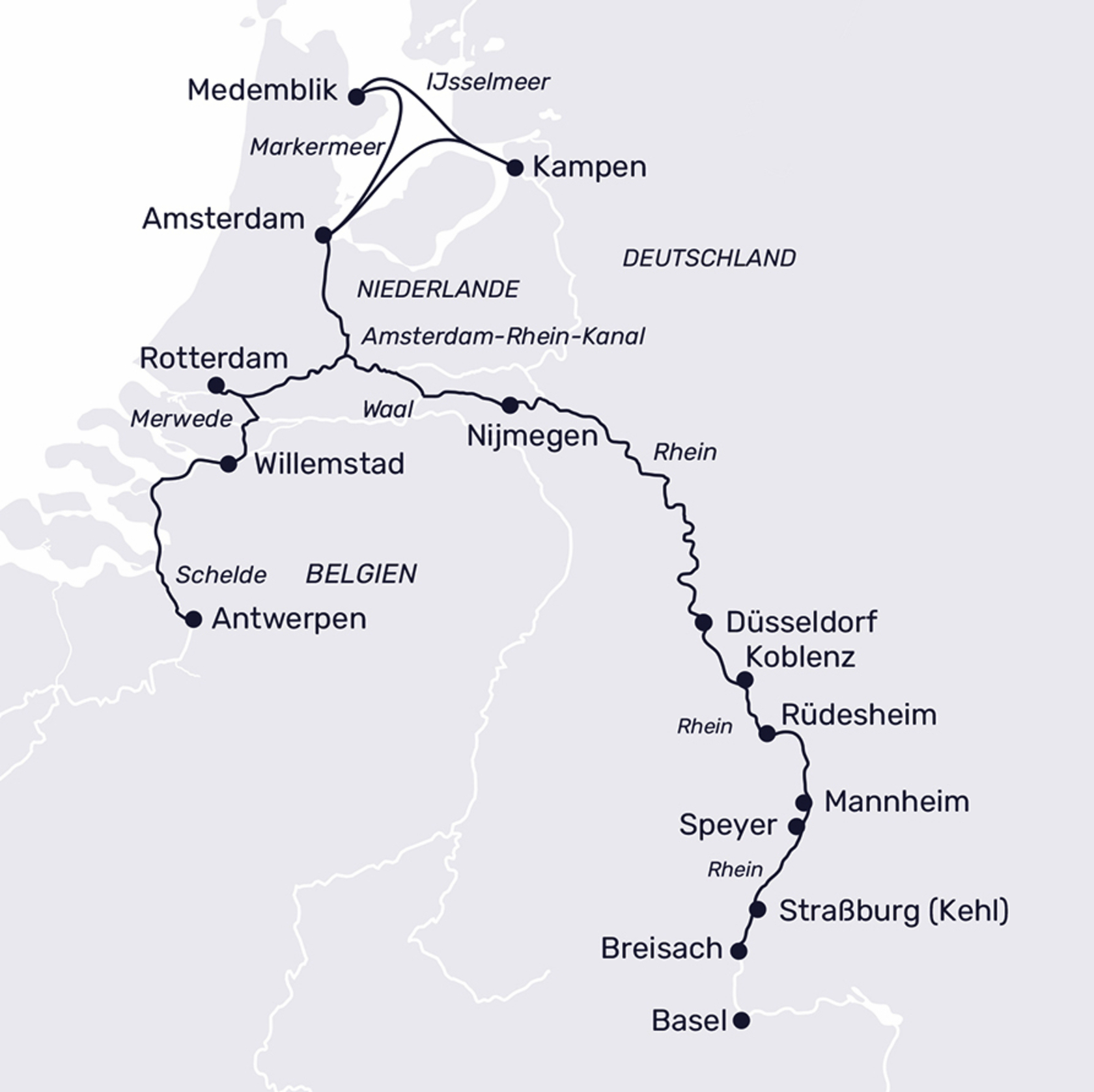 Düsseldorf – Amsterdam – Medemblik – Rotterdam – Antwerp – Nijmegen – Koblenz – Rüdesheim – Kehl – Breisach – Mannheim – Düsseldorf