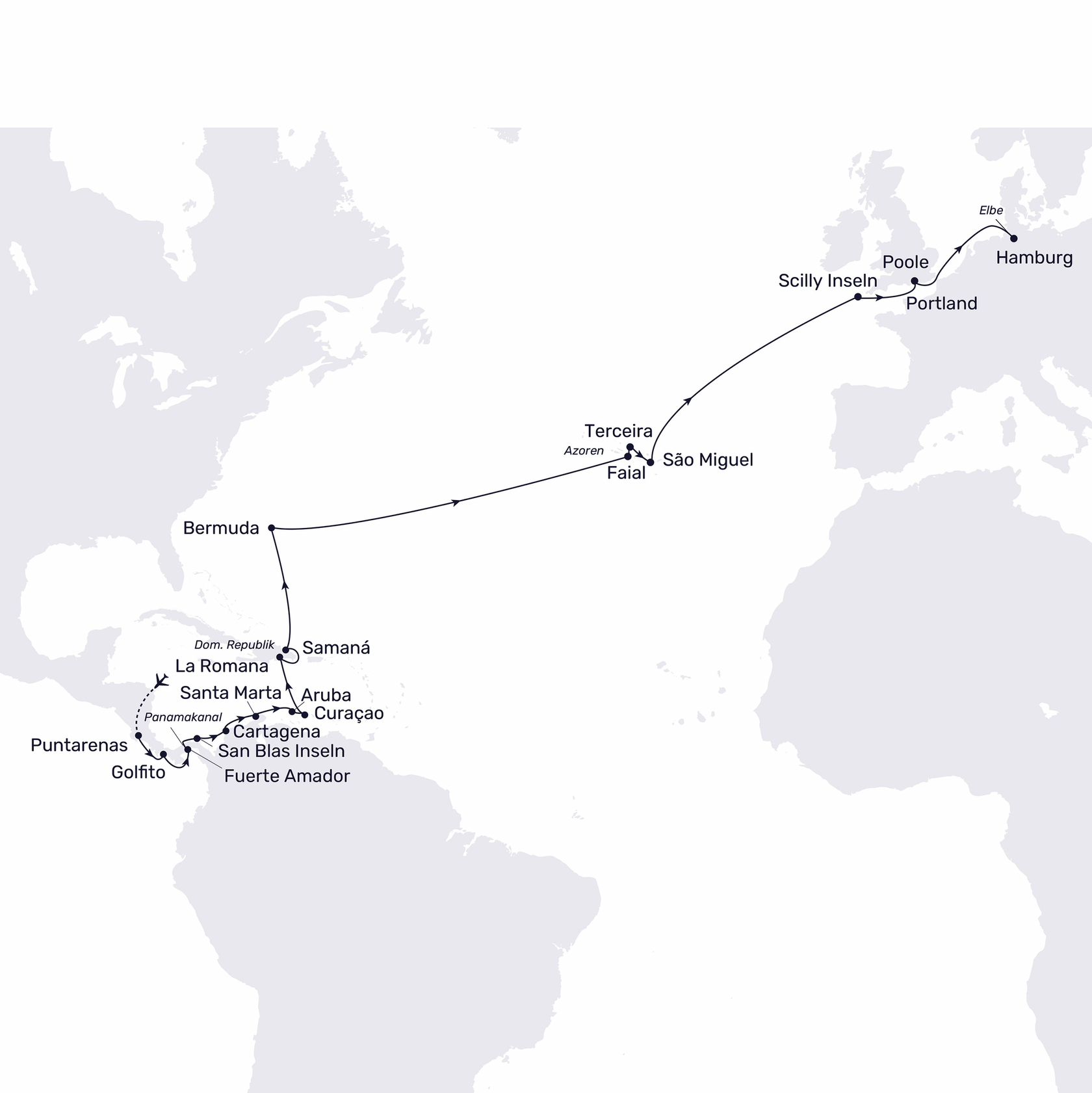 Puntarenas – Costa Rica – Panama – Kolumbien – Aruba – Curaçao – La Romana – Dominikanische Republik – Bermuda – Portugal – Großbritannien – Hamburg